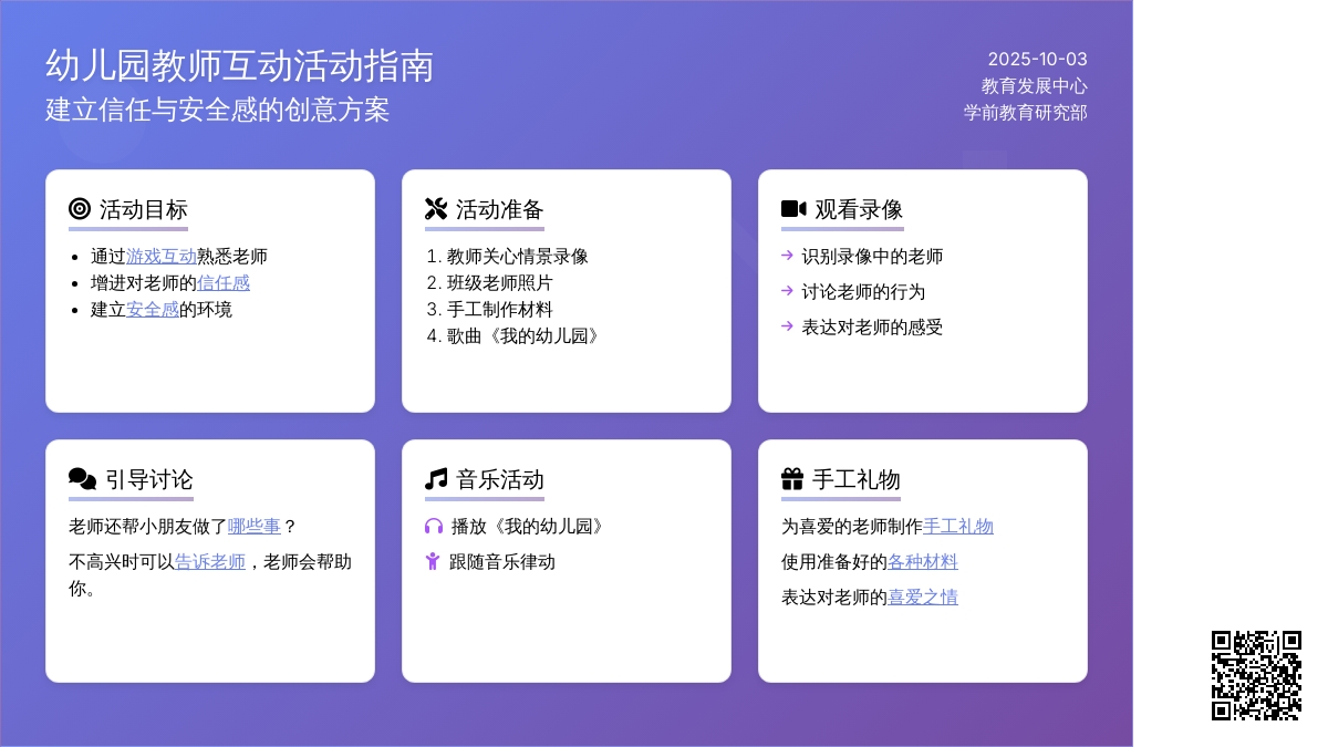 活动准备:?一些教师关心孩子的情景录像。(如:安慰孩子,带孩子活动)?班上老师的照片各一张,各种手工制作材料。?歌曲《我的幼儿园》