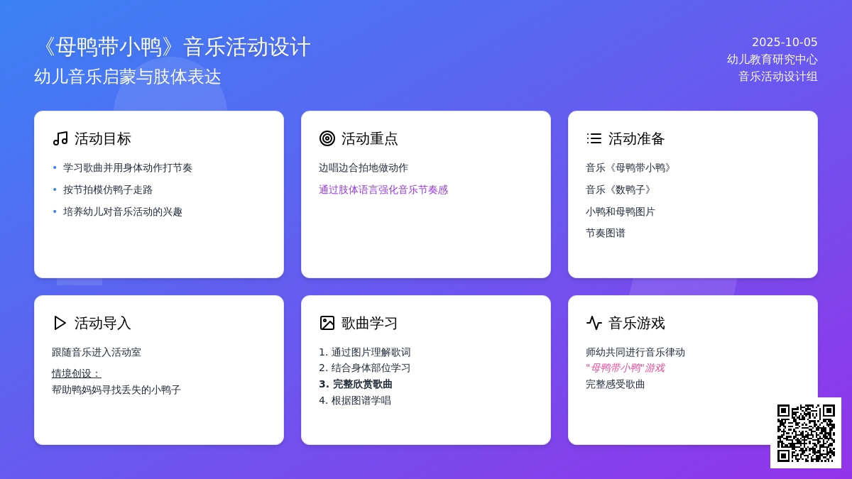 《母鸭带小鸭》是一首较经典的儿歌,旋律欢快、歌词简单,较适合小年龄段幼儿演唱并表演,根据本班幼儿喜爱唱歌跳舞的特征和容易进入情境的特点,让幼儿通过自己的观察,师幼的互动,在轻松和愉快的氛围中学习歌曲,懂得用动作来为歌曲打节奏,教师营造母鸭带小鸭的氛围帮助幼儿感受音乐作品中快乐的感觉,特设计了此次活动。