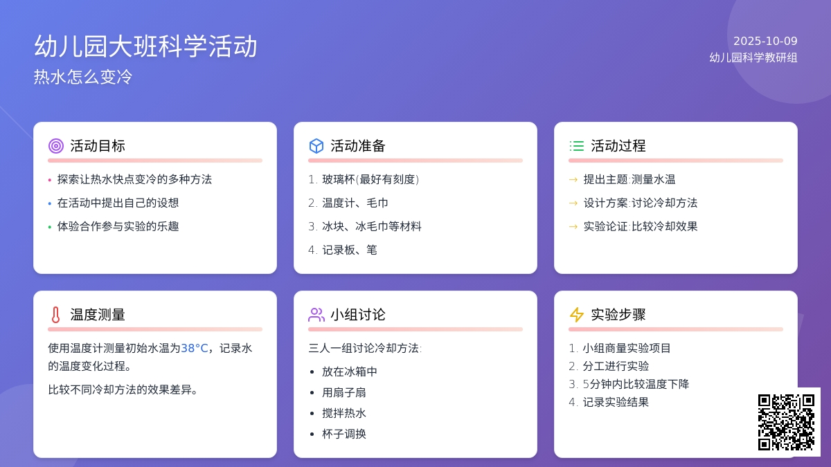 1、师:你们有哪些办法能让热水快点变冷呢?请你们三人一组,把你们商量的方法一个个记录在格子里。
