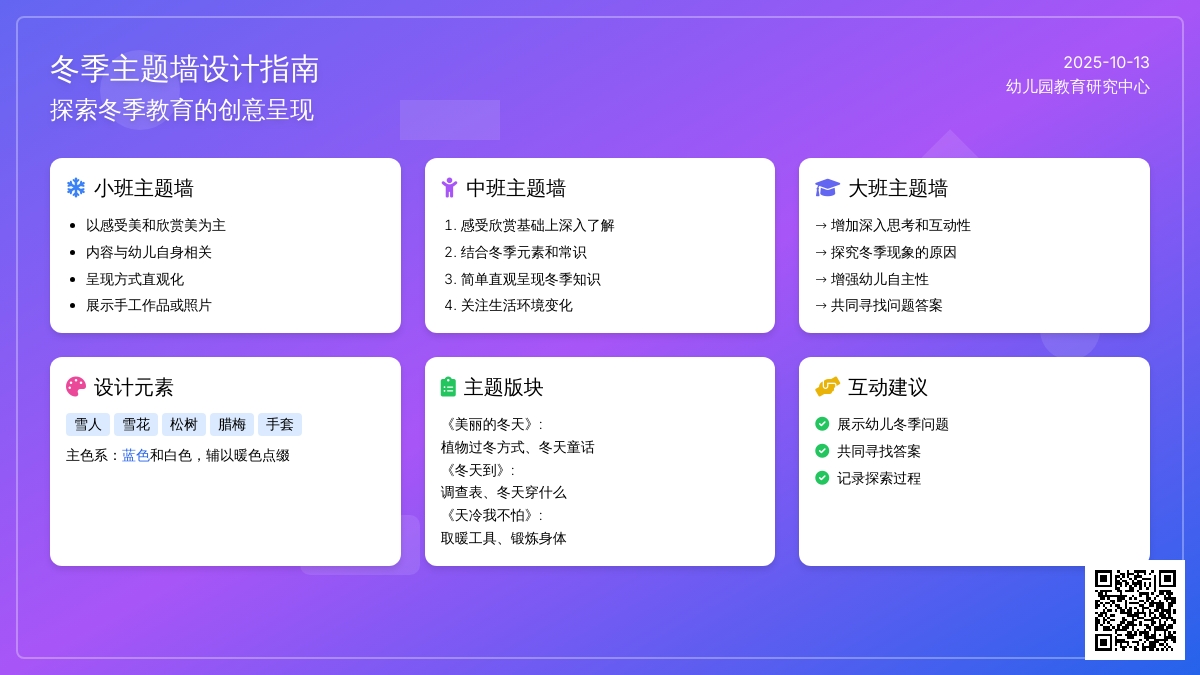 冬天是个庞大的主题,和每个季节主题一样,小编把它总结为天、地、人三个大方向,涉及到的支线可以很多,反应在主题墙上更是五花八门。以下仅为给大家参考的思路,实际要以幼儿的年龄段、认知水平、兴趣点为基准来制定。