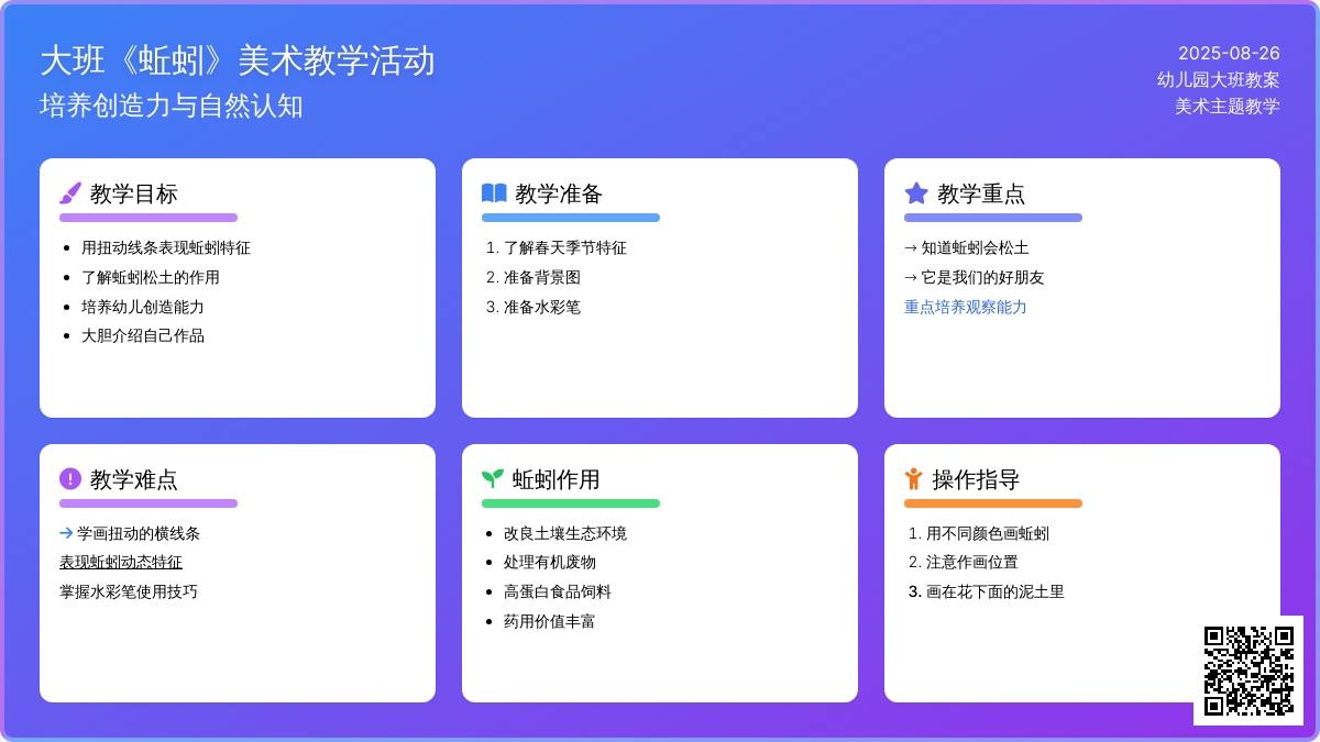 大班《蚯蚓》适用于大班的美术主题教学活动当中,让幼儿知道蚯蚓会松土,它是我们的好朋友,喜欢使用水彩笔,尝试用扭动的线条表现蚯蚓的外形特征,培养幼儿初步的创造能力,快来看看幼儿园大班《蚯蚓》吧。