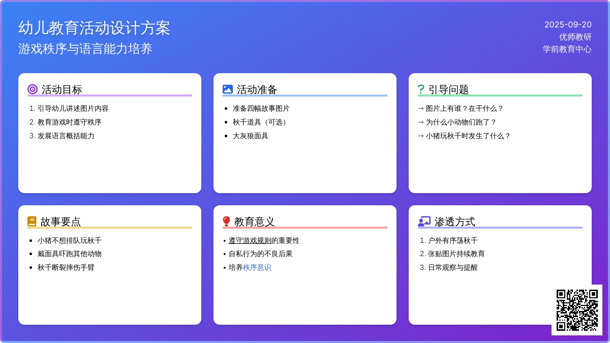 1、在理解图片内容的基础上,引导幼儿进行讲述并教育幼儿在游戏时要遵守秩序。